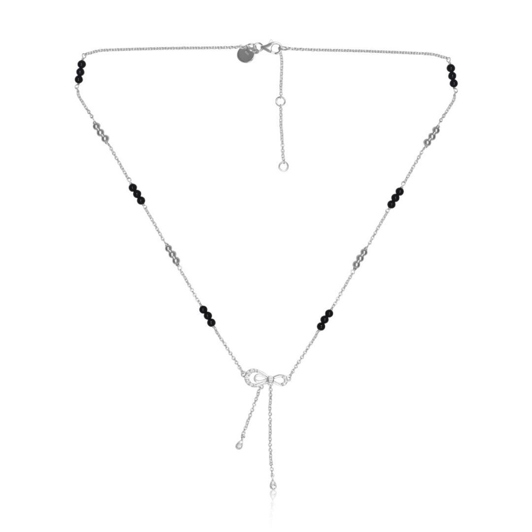 Celebrate the knot of marriage with The Ribbon of Love Mangalsutra. Expertly crafted from 925 Sterling Silver with a radiant white finish, this piece offers a whimsical and feminine take on traditional jewelry.