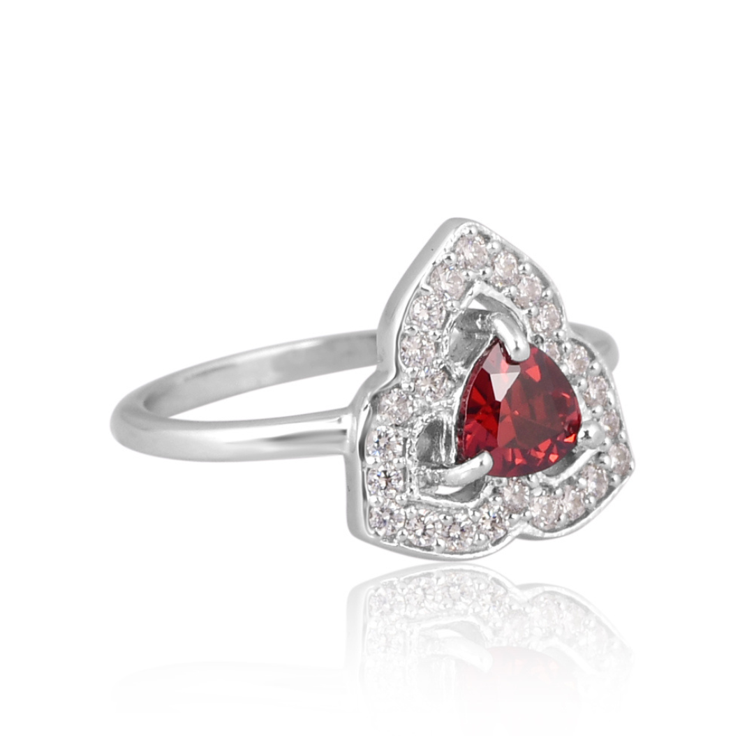 Make a sophisticated statement with the Crimson Trillion Halo Ring. This piece stands out with its distinctive geometric design, centering on a deep red Garnet Zircon cut in a sharp, modern trillion (triangle) shape.