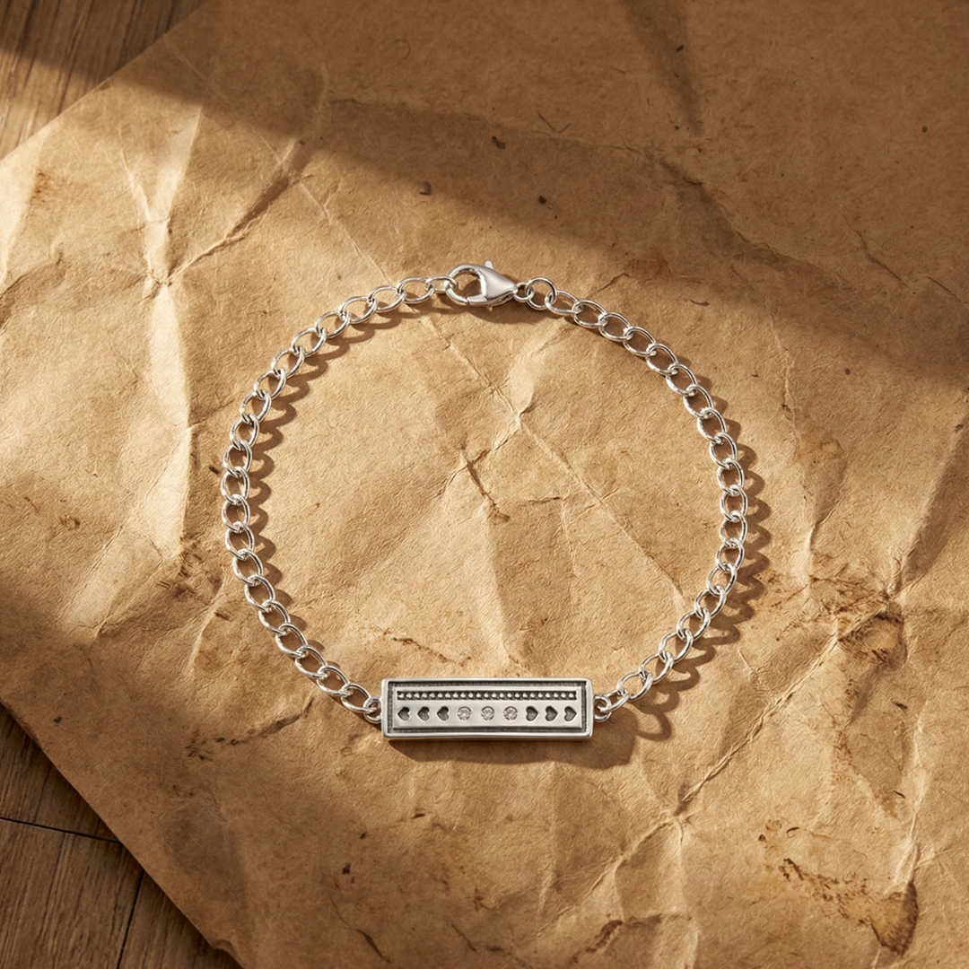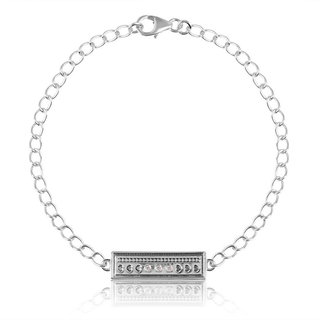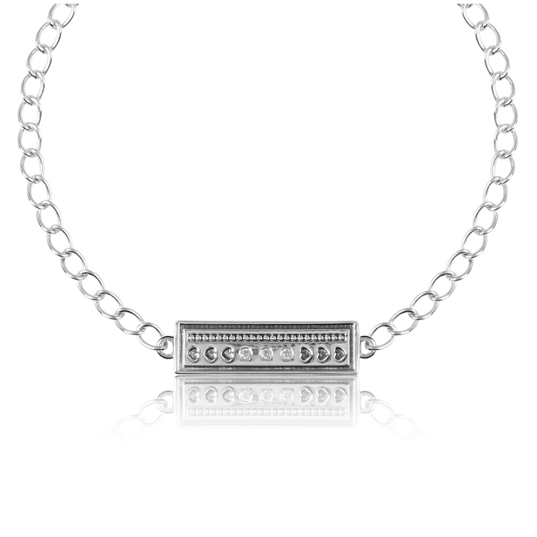 Combine sentiment with style in The Devotion Link bracelet. Crafted from solid 925 Sterling Silver, this piece features a classic cable chain secured by a sturdy lobster clasp. The focal point is a rectangular station bar intricately designed with a row of recessed heart shapes and a textured, milgrain (beaded) upper edge.