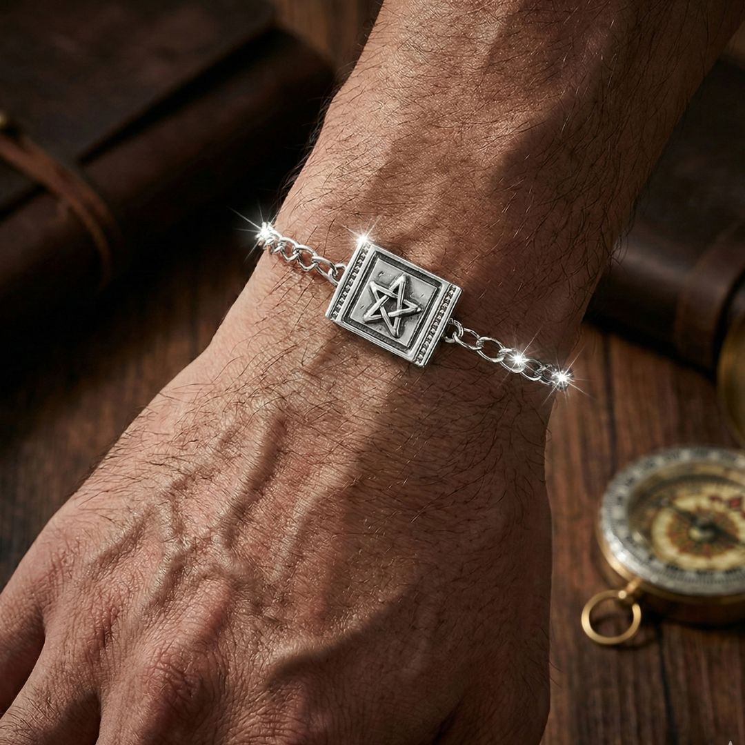 The focal point is a square station containing a raised, interlaced pentagram—a timeless symbol often representing the five elements (earth, air, fire, water, and spirit) and protection. The star is set against a dark, oxidized background, which creates depth and allows the polished silver lines to shine. The station is framed by a detailed, beaded (milgrain) border, adding a rugged, finished look to the design.