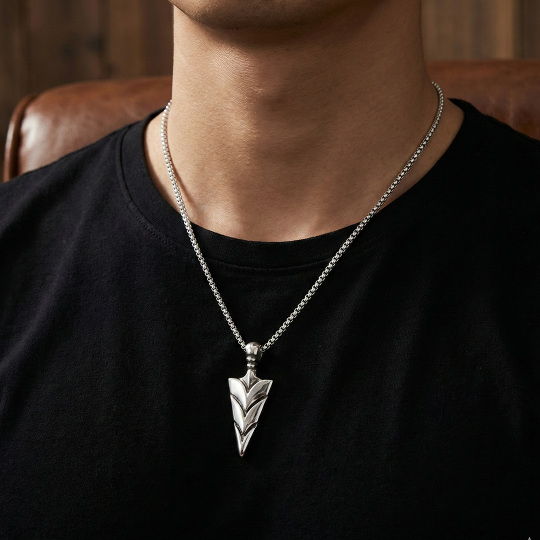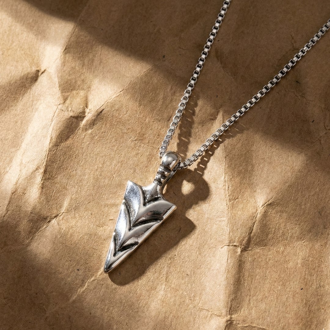 Define your style with sharp precision using The Vanguard Point pendant. Crafted from solid 925 Sterling Silver, this piece takes the form of a stylized arrowhead or spear tip—a universal symbol of determination, focus, and the warrior spirit.